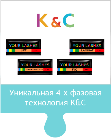 Технология K&C (КЕРАТИНО-КОЛЛАГЕНОВЫЙ ЛИФТИНГ) основана на четырех ключевых фазах ламинирования, главной отличительной особенностью которой является наличие структурно-восстановительного этапа K&C между фазами лифтинга и фиксации. Интерпретируя в буквальном смысле, этап K&C представляет собой наполнение ресниц и бровей свободными молекулами КЕРАТИНА и КОЛЛАГЕНА, которые заполняют пустоты и поврежденные участки, укрепляют и обволакивают структуру, обеспечивают восстановительный процесс, увеличивают плотность, толщину и сопротивляемость. Мощное укрепляющее действие обусловлено не только выбором соответствующих ингредиентов, но и, главным образом, моментом наполнения ресниц и бровей молекулами кератина и коллагена – в период максимального раскрытия и восприимчивости чешуек к глубокому структурированию.
